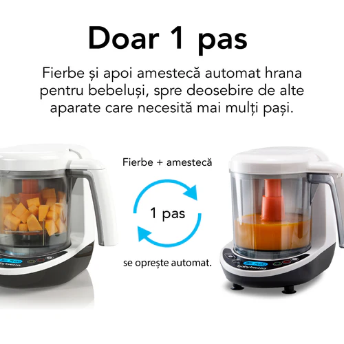 Versatil — nu doar pentru bebelușiPoți pregăti la abur paste, legume, supe sau ouă — aparatul funcționează perfect și pentru alimentele întregii familii. BPA-Free, sigur pentru bebeluși și garanție 2 ani. |