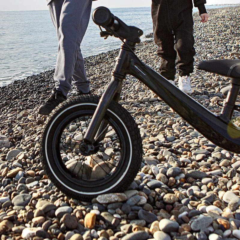 Roți de 12" cu cauciuc gonflabilJante de aluminiu șlefuit cu anvelope de cauciuc gonflabil de 12" cu profil — absorbție excelentă a șocurilor și aderență pe orice suprafață. Furca din oțel cu vopsire imitație fibră de carbon completează aspectul premium al bicicletei. |